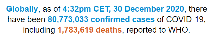 根据世卫组织最新实时统计数据,截至欧洲中部时间12月30日16时32分(北京时间12月30日23时32分),全球累计新冠肺炎确诊病例80773033例,累计死亡病例1783619例。30日全球新冠肺炎确诊病例新增563983例,死亡病例新增11784例。(总台记者 朱赫)