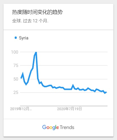 △谷歌趋势显示:“叙利亚”关键词除了在2020年3月前后搜索频度出现过升高以外,其余时间都处于缓慢下降的趋势