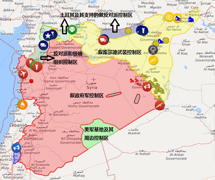 说了这么多,你也许会问:目前谁控制着哪里?屈指细数,除叙利亚政府军外,叙境内的武装力量主要有以下四股:叙利亚库尔德武装主要控制叙东部和东北部地区;土耳其军队及其支持的叙反对派控制叙北部土叙边境地区大片土地;叙利亚反对派和极端组织控制叙西北部伊德利卜省大部分区域;美军则在叙东部与约旦接壤的沙漠地带建有坦夫军事基地,与此同时在叙东部一些油气田附近保留着多个据点。