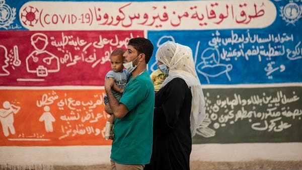 △叙利亚东北部哈塞克省,一户家庭从当地的防疫宣传画前走过。(图片来自法新社)