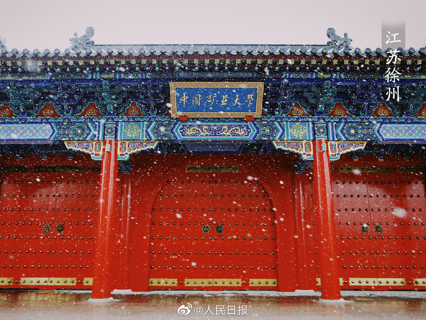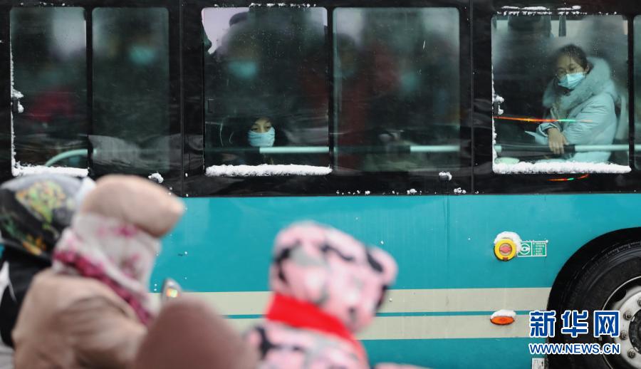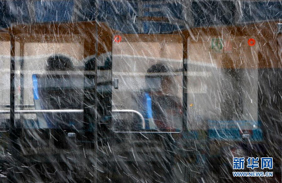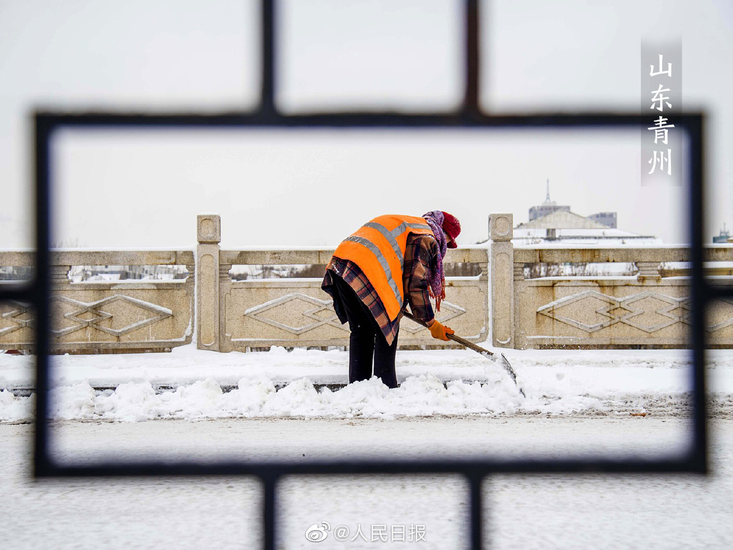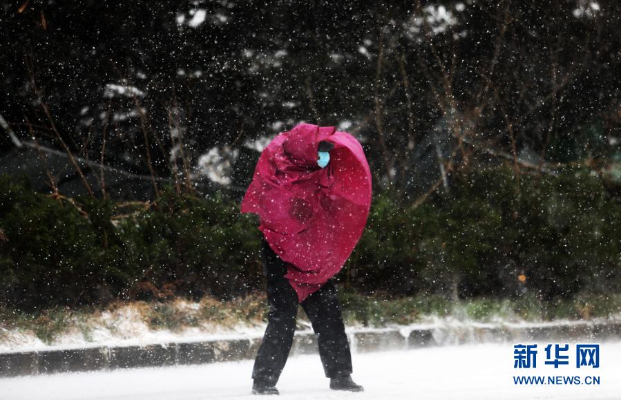 29日,在山东省临沂市郯城县街头,一名行人在风雪中艰难前行,雨衣被大风吹起。