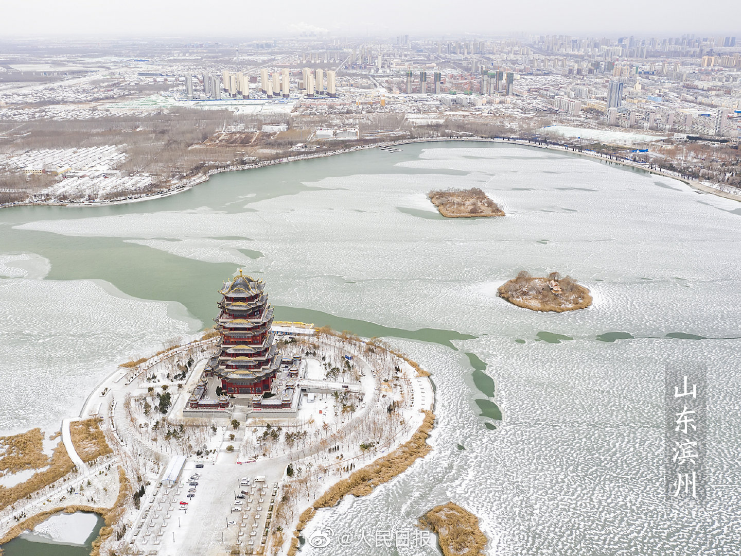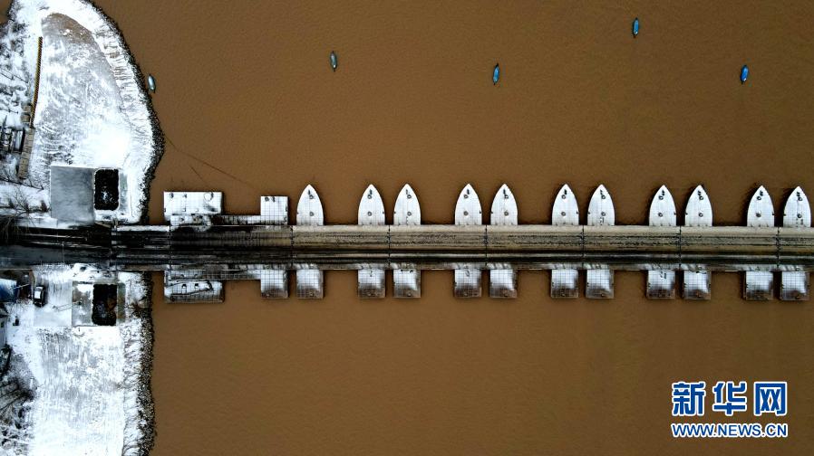 昨日开始,入冬最强寒潮来袭,多地迎来降雪天气。图为29日在山东省滨州市拍摄的黄河浮桥(无人机照片)。(来源:人民日报微博、新华社)