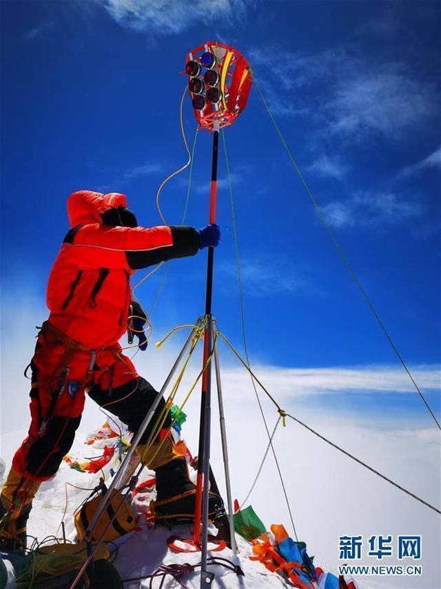 2020珠峰高程测量登山队队员在开展测量工作。新华社特约记者 扎西次仁摄