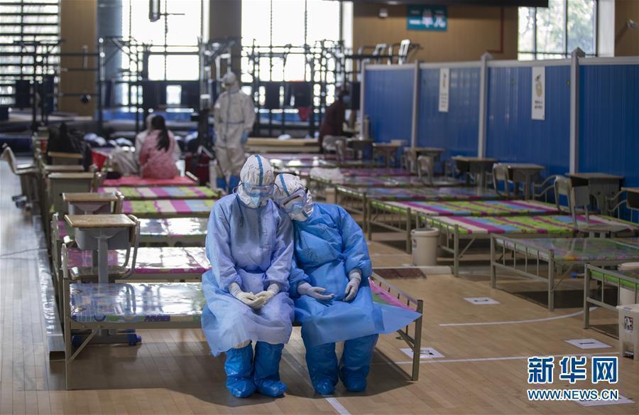 两位青海医疗队队员在武昌方舱医院等待出舱时小憩。新华社记者 费茂华摄