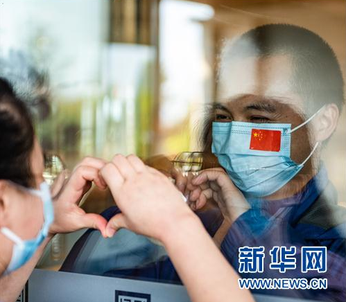 一位贵州医疗队队员返回后和妻子在隔离酒店门口隔着玻璃比心。新华社记者 陶 亮摄