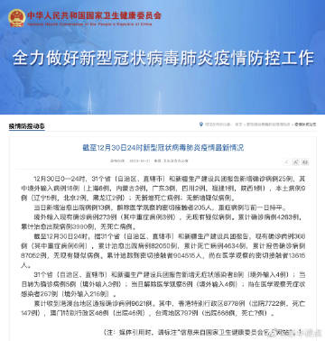 截至12月30日24时,据31个省(自治区、直辖市)和新疆生产建设兵团报告,现有确诊病例368例(其中重症病例6例),累计治愈出院病例82050例,累计死亡病例4634例,累计报告确诊病例87052例,无现有疑似病例。累计追踪到密切接触者904515人,尚在医学观察的密切接触者13615人。