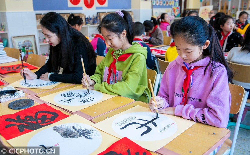 ↑2020年12月29日,内蒙古呼和浩特市玉泉区恒昌店巷小学师生在书写以生肖“牛”为主题的书法作品。CICPHOTO/丁根厚 摄