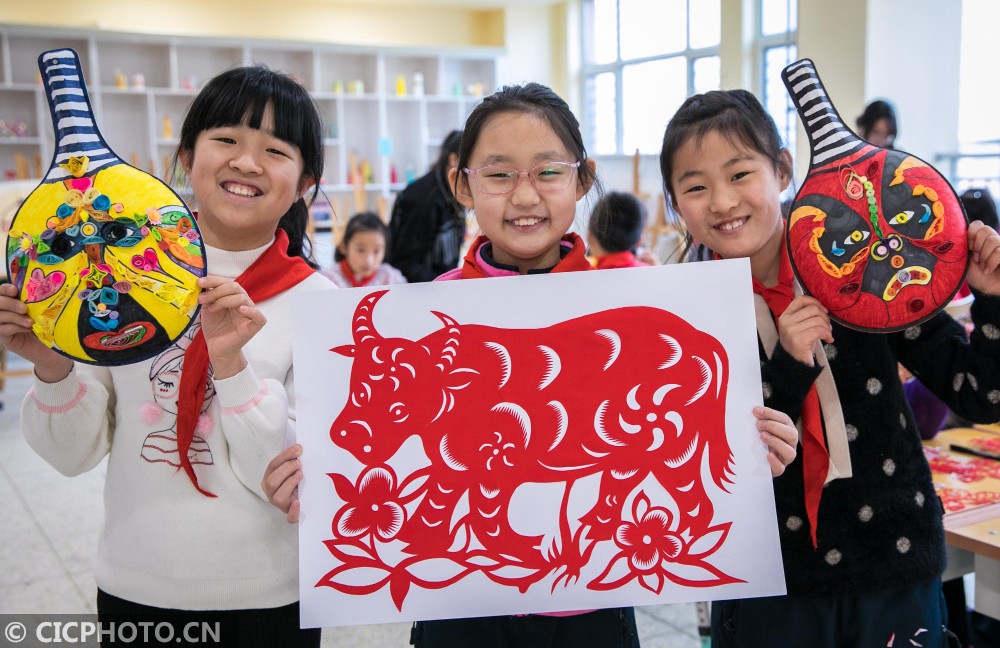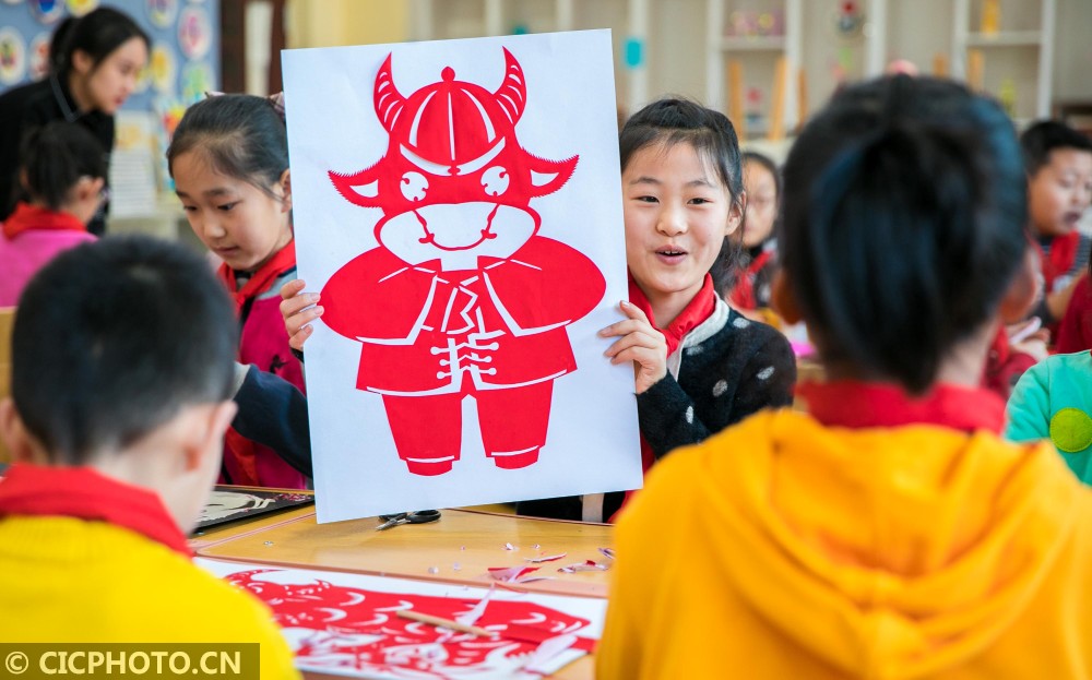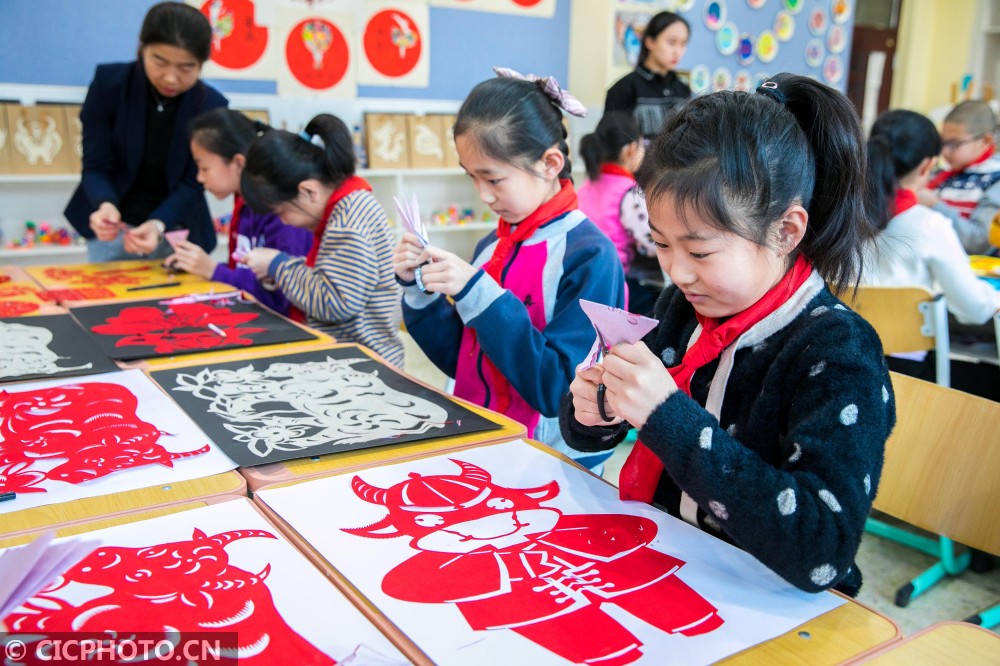 ↑2020年12月29日,内蒙古呼和浩特市玉泉区恒昌店巷小学学生在制作以生肖“牛”为主题的剪纸作品。CICPHOTO/丁根厚 摄