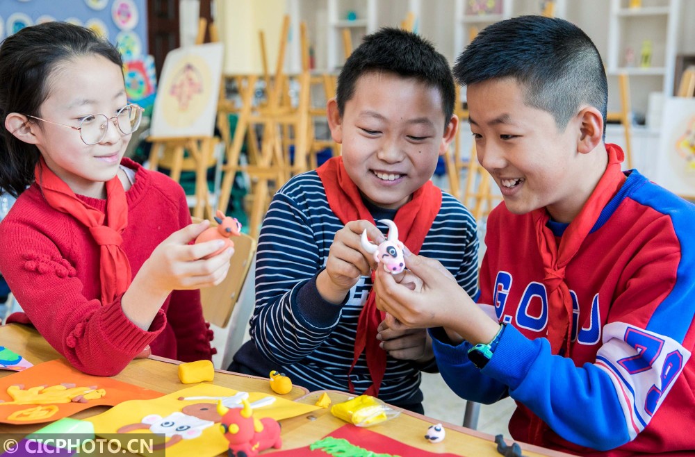 ↑2020年12月29日,内蒙古呼和浩特市玉泉区恒昌店巷小学学生在捏制“萌牛”面塑作品。CICPHOTO/丁根厚 摄