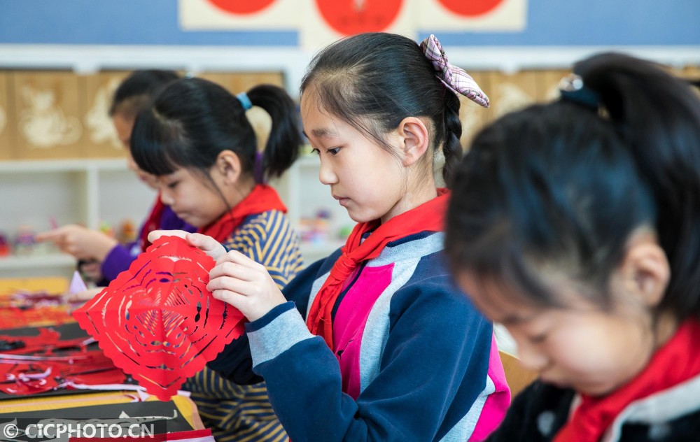 ↑2020年12月29日,内蒙古呼和浩特市玉泉区恒昌店巷小学学生在剪窗花。CICPHOTO/丁根厚 摄