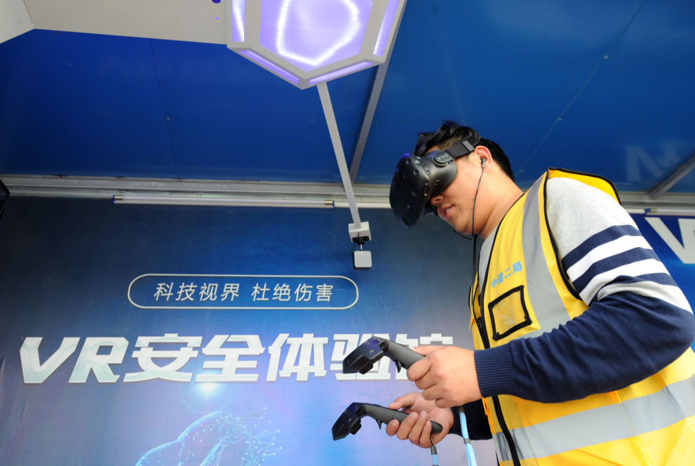 12月27日,在广东梅州人民医院新住院大楼项目现场,工人使用VR智能设备进行施工安全培训。新华社发(刘玉和 摄)