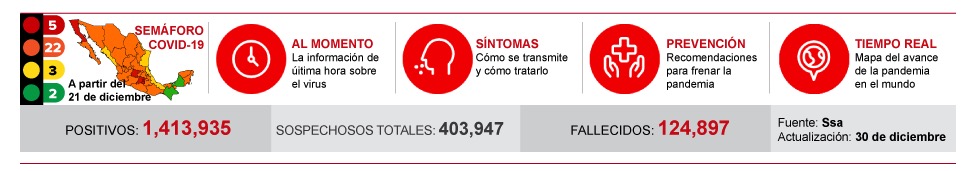 当地时间12月30日,墨西哥卫生部宣布,截至当地时间12月30日19时,墨西哥较前一天新增新冠肺炎确诊病例12406例,累计确诊病例达1413935例;新增死亡病例1052例,累计死亡病例已上升至124897例。(总台记者 盛嘉迪 吕兴林)
