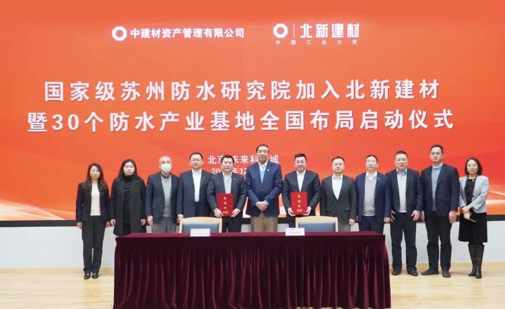 12月30日,防水行业唯一国家级研究院——中国建筑材料科学研究总院苏州防水研究院(以下简称“苏州院”)加入北新集团建材股份有限公司(以下简称“北新建材”)签约仪式在北京未来科学城北新中心举行。北新建材党委书记、董事长王兵和中建材资产管理公司党委书记、执行董事、总经理高则怀分别代表双方签署战略合作协议,中国防水协会秘书长朱冬青代表行业见证签约,签约仪式由北新建材副总经理管理主持。中建材资产管理公司副总经理刘志平、财务部总经理商庆国,苏州院院长巢文革、副院长瞿建民、总工程师杨胜,以及北新防水集团在京干部员工见证签约。