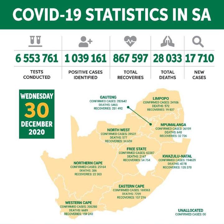 当地时间12月30日,南非卫生部确认南非当天新增新冠肺炎病例17710例,累计确诊1039161例;新增死亡病例465例,累计死亡28033例;累计康复867597例。