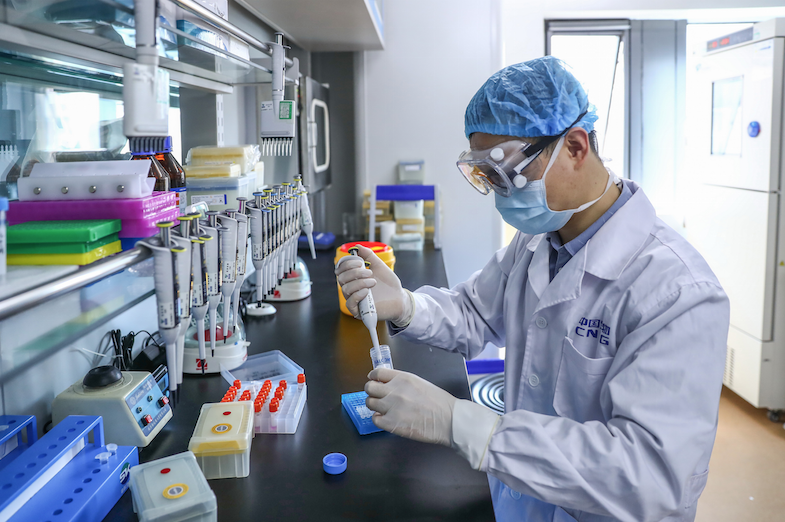 ▲2020年4月11日,工作人员在国药集团中国生物新冠疫苗生产基地质量检定部门对新型冠状病毒灭活疫苗样品进行杂质检测。图/新华社发