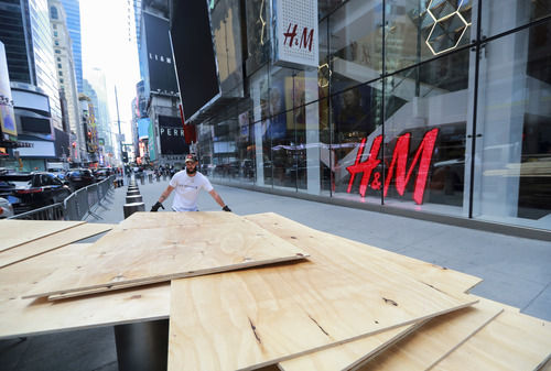6月1日,因抗议活动持续,工人在时报广场为商店加装护板求安全。新华社记者王迎摄
