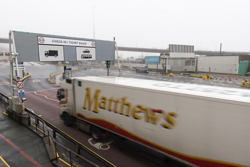 1月31日,在英国东南部城市多佛,车辆驶入多佛港准备出关离开英国。新华社发(雷伊·唐摄)