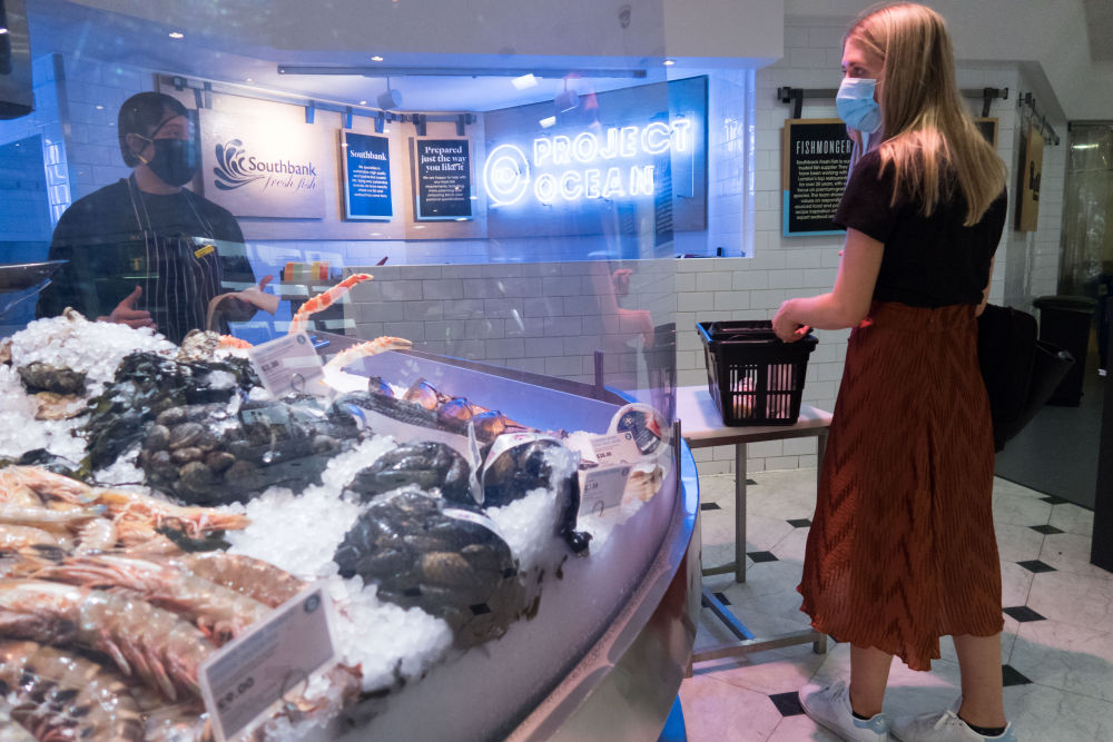 7月24日,一名戴口罩的顾客在英国伦敦一家百货公司的餐饮区挑选生鲜。新华社发(蒂姆·爱尔兰摄)