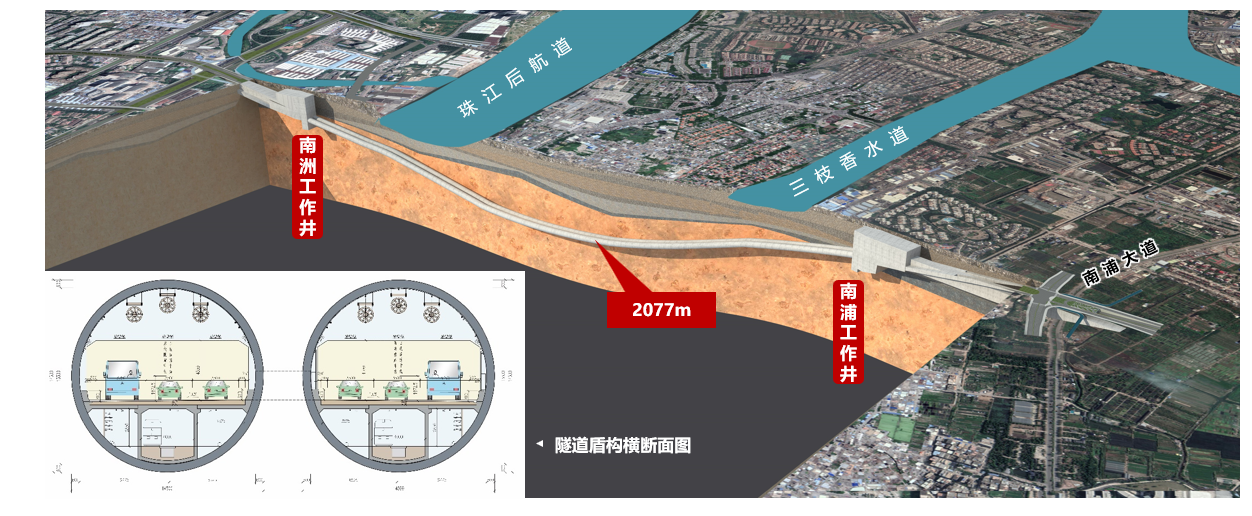 广州南站快速通道北段工程全长4.35公里,过江隧道长3.46公里,将在广州首次采用外径14.5米超大直径盾构方式下穿珠江水道。北段工程预计2024年建成开通。