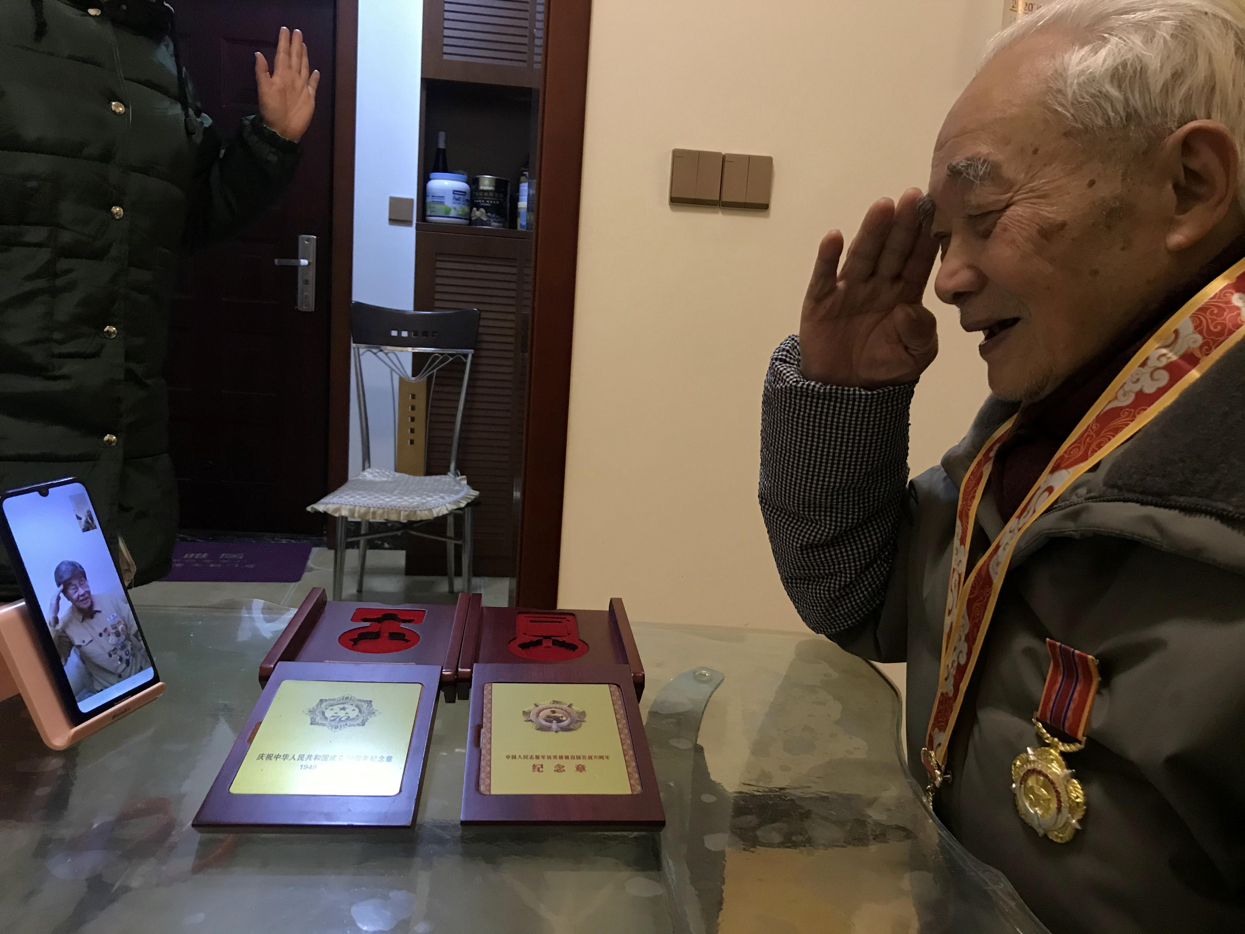 于是,在12月28日上午,在双方儿女的帮助下,郑重穿上志愿军军装、胸前挂满奖章的蔡老出现在蒋老面前的手机屏幕上;同时,胸前挂着中华人民共和国成立70周年纪念章和中国人民志愿军抗美援朝出国作战70周年纪念章的蒋老也出现在了蔡老面前的手机上。