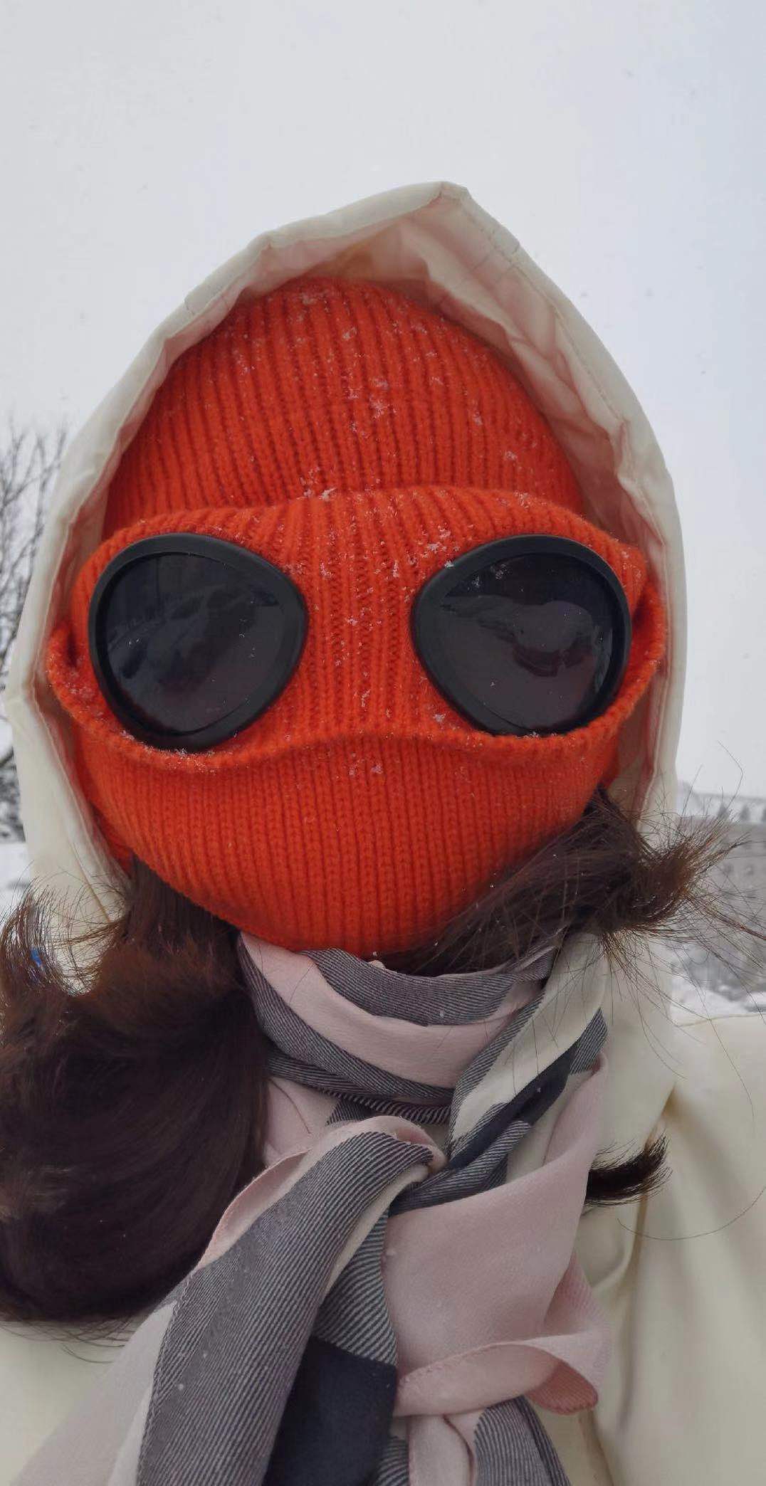 网友在各网络平台上展示的图片和视频显示,当地降雪量较大且伴随大风,行人在路上行走困难。还有人晒出了“上班装束”:只见一个姑娘“全副武装”,帽子将头部完全包裹住,只露出了两只眼睛,让人觉得格外保暖可爱。