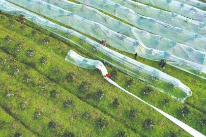 12月23日,在广安市武胜县宝箴塞镇双河口村晚熟柑橘基地,当地务工人员正在为果树覆膜保温防冻,抵御即将到来的霜冻寒潮,确保明年2月份晚熟柑橘保质保量上市。