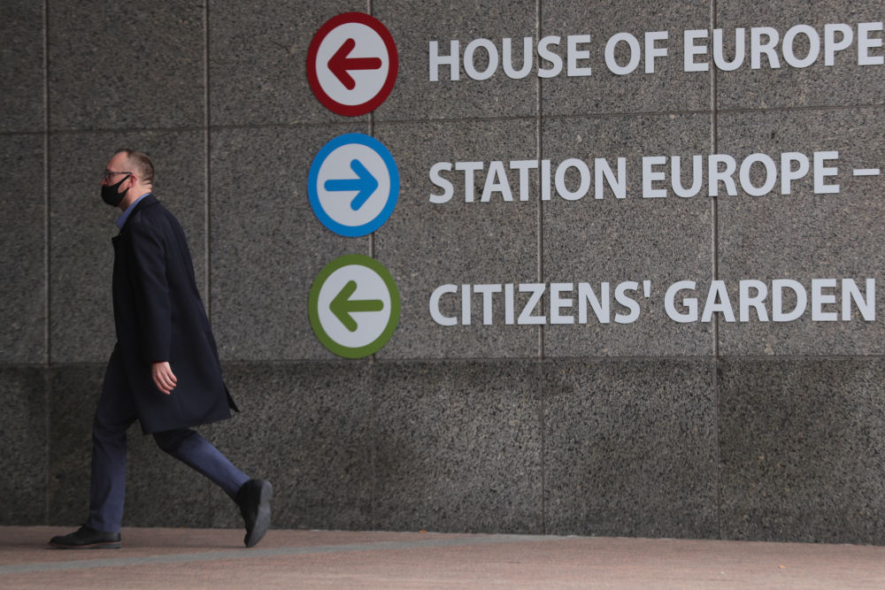 10月16日,一名男子在比利时布鲁塞尔的欧洲议会附近行走。(新华社记者郑焕松摄)