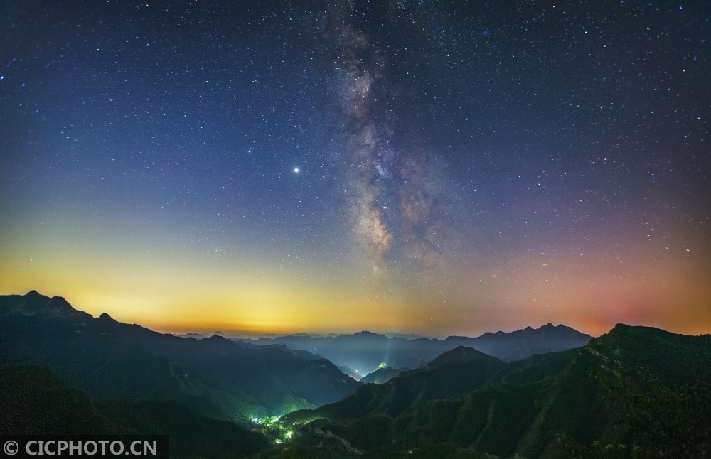 ↑2020年9月19日,在北京市房山区蒲洼乡,山峦之上银河与远处城市的光芒争辉。CICPHOTO/马逸伦 摄
