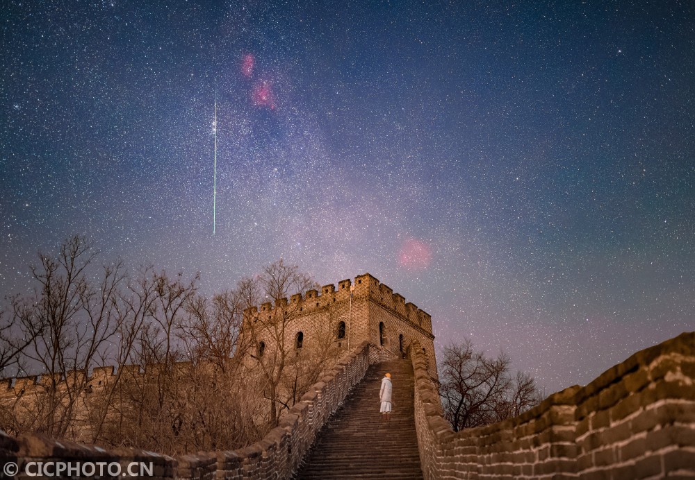 ↑2020年12月14日,在北京市怀柔区慕田峪长城,一名游客在流星划过时刻许下心愿。CICPHOTO/黄登 摄
