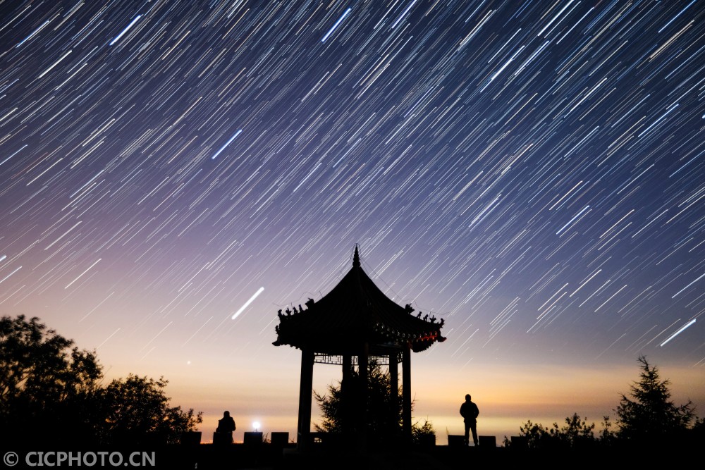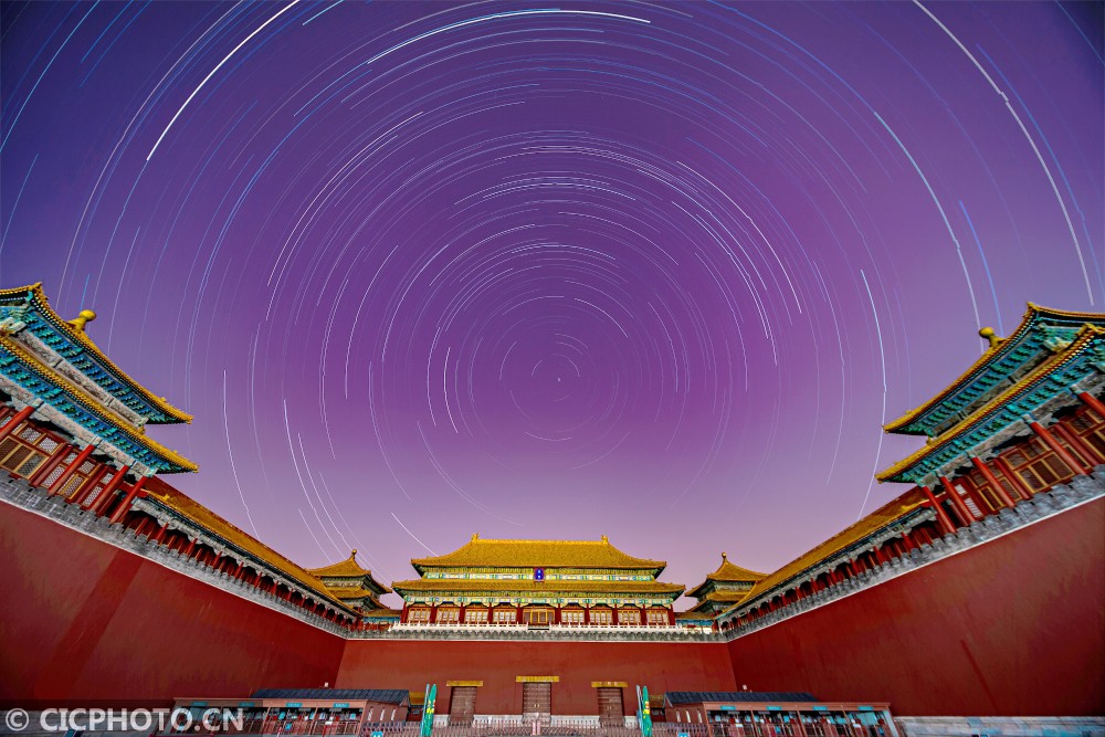 ↑2020年9月20日,在北京故宫紫禁城拍摄的夜空星轨。CICPHOTO/钟奕 摄