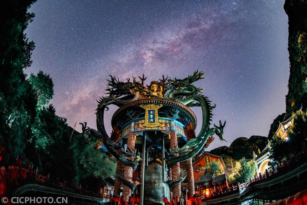 ↑2020年9月21日,在北京市门头沟区白瀑寺,深山宁静的古刹与夜空璀璨的银河相呼应。CICPHOTO/许晓平 摄