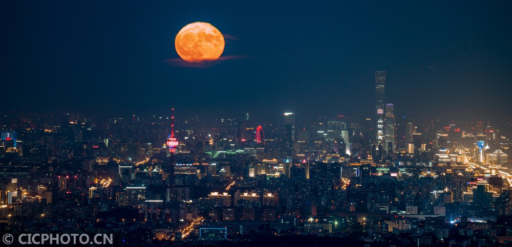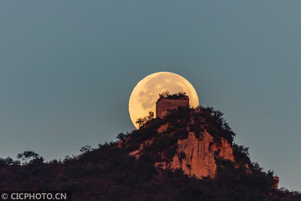 ↑2020年10月3日,在北京市怀柔区拍摄的夜景,一轮明月攀援绝壁上。CICPHOTO/周博 摄