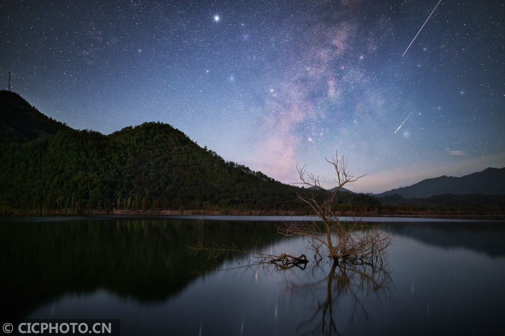 ↑2020年8月12日,在安徽省宁国青龙湾生态区拍摄的星落孤树(英仙座流星雨)。CICPHOTO/张潇 摄