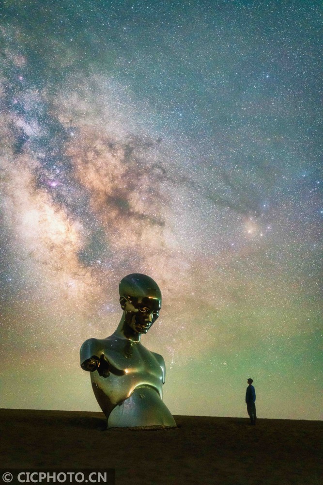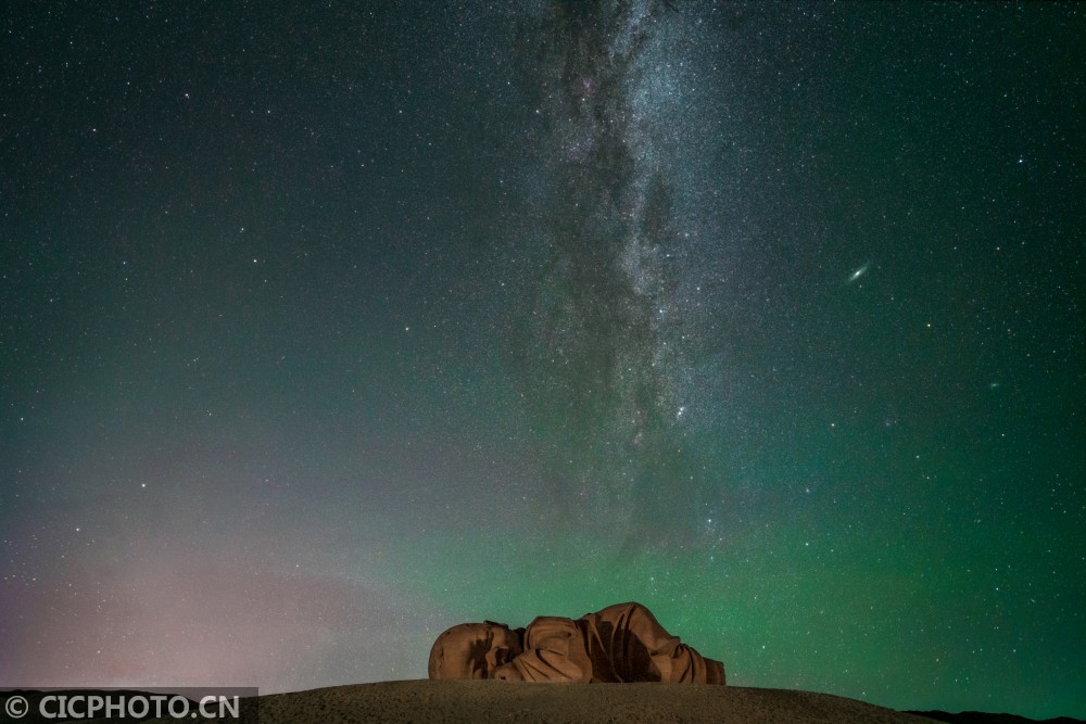 ↑2020年8月17日,在甘肃省瓜州县,“大地之子”在星空之下沉睡。CICPHOTO/杜超 摄