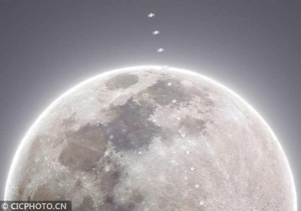 ↑2020年4月4日,在北京市怀柔区拍摄的凌月。明亮的国际空间站从月球前方通过,通过连续录制的影像叠加出了国际空间站的运动轨迹。CICPHOTO/王乐天 摄