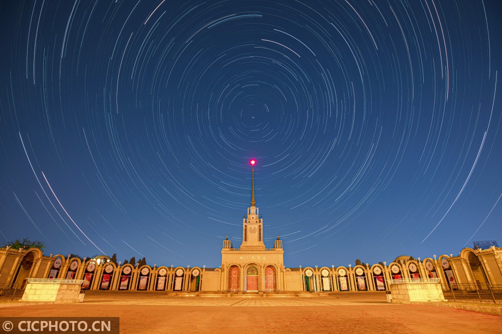 ↑2020年4月24日,在北京市展览馆拍摄的星轨。CICPHOTO/吴鲁萍 摄