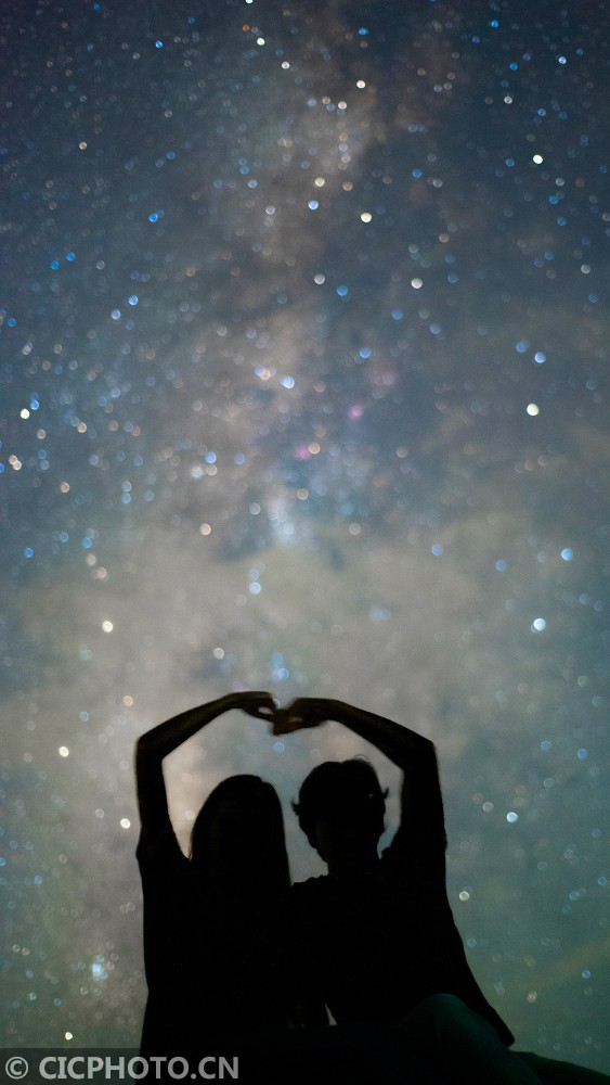 ↑2020年8月15日,在广东省南雄市军营寨,一对情侣在星空下留念。CICPHOTO/蔡文毅 摄
