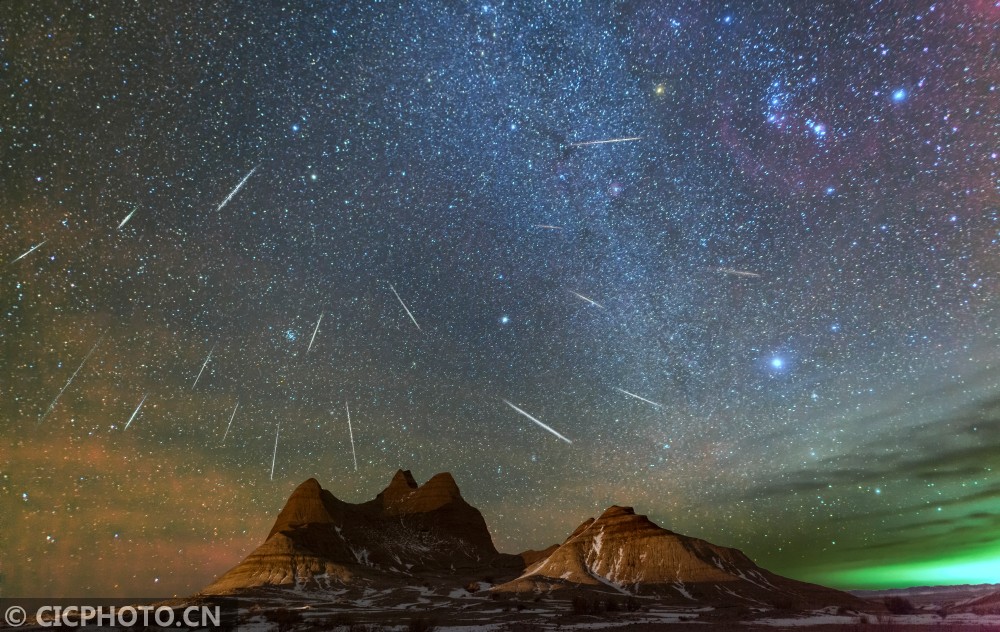 ↑2020年12月13日,在甘肃省嘉峪关沙枣园拍摄的双子座流星雨。(多张叠加)CICPHOTO/赵颖 摄