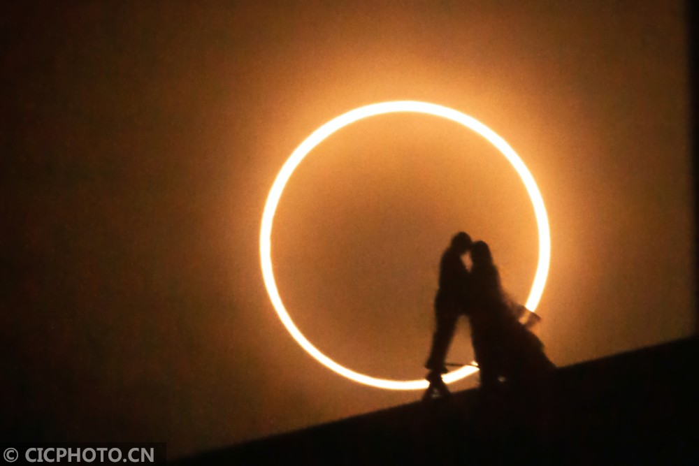 ↑2020年6月21日,在福建省厦门市拍摄的一堆情侣在日环食下依偎。CICPHOTO/罗弘扬 摄