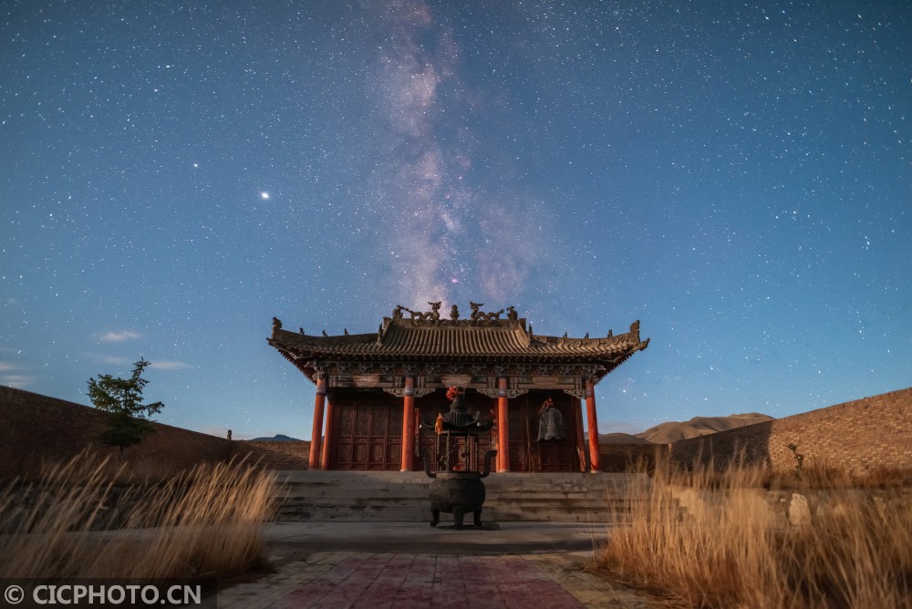 ↑2020年7月12日,在甘肃省白银市永泰古城,夏季后半夜的星河垂于庙宇之上,仿佛直达仙界的天梯。CICPHOTO/尹攀 摄