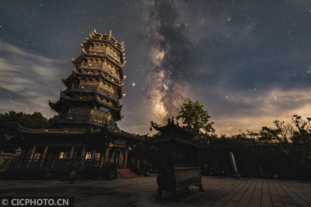 ↑2020年9月18日,在安徽省池州市九华山,深邃的天空之眼横跨在九华宝塔之上。CICPHOTO/何宏程 摄