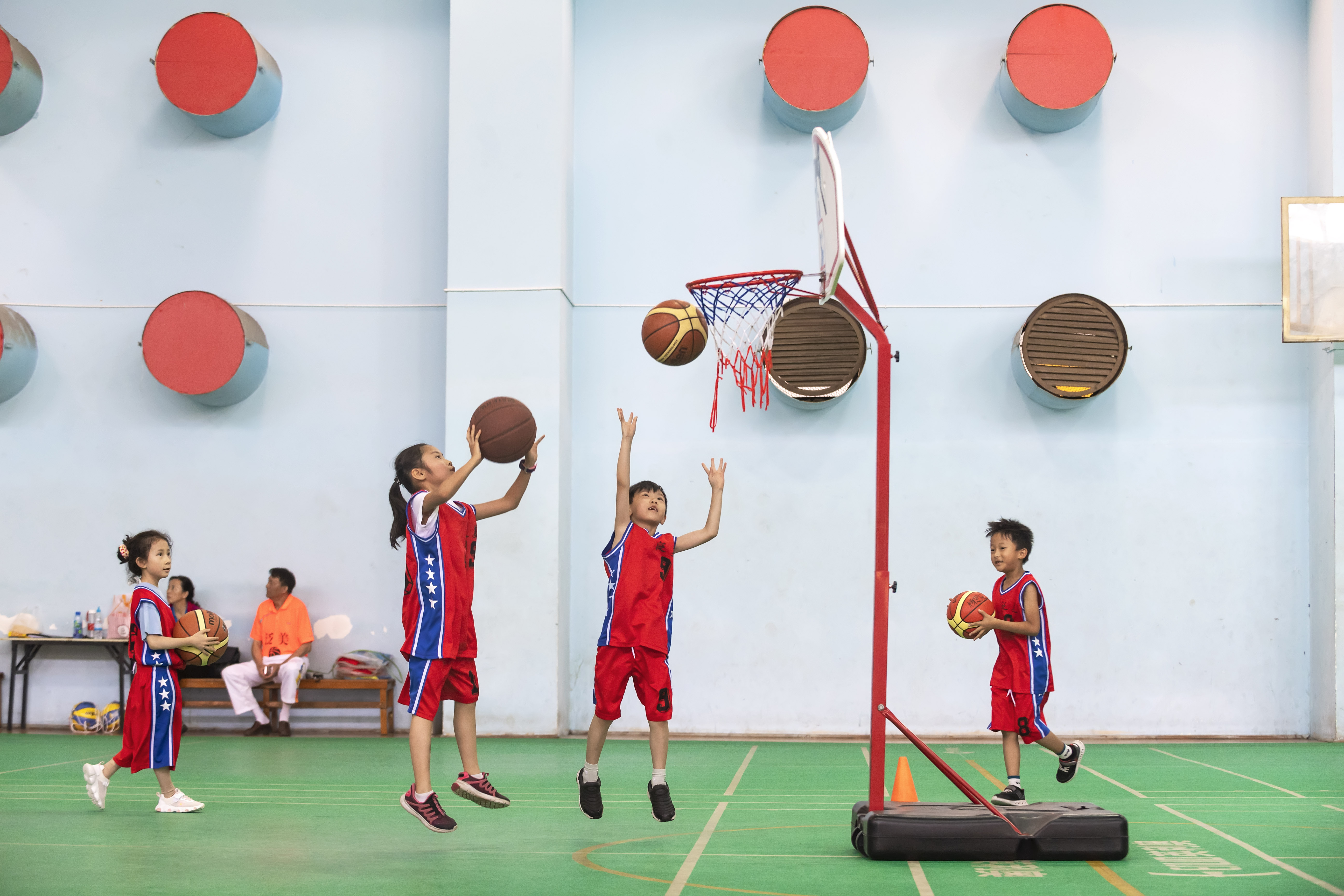 8月4日,在昆明市体育馆内,篮球培训班学员们在练习投篮。新华社发(陈欣波摄)