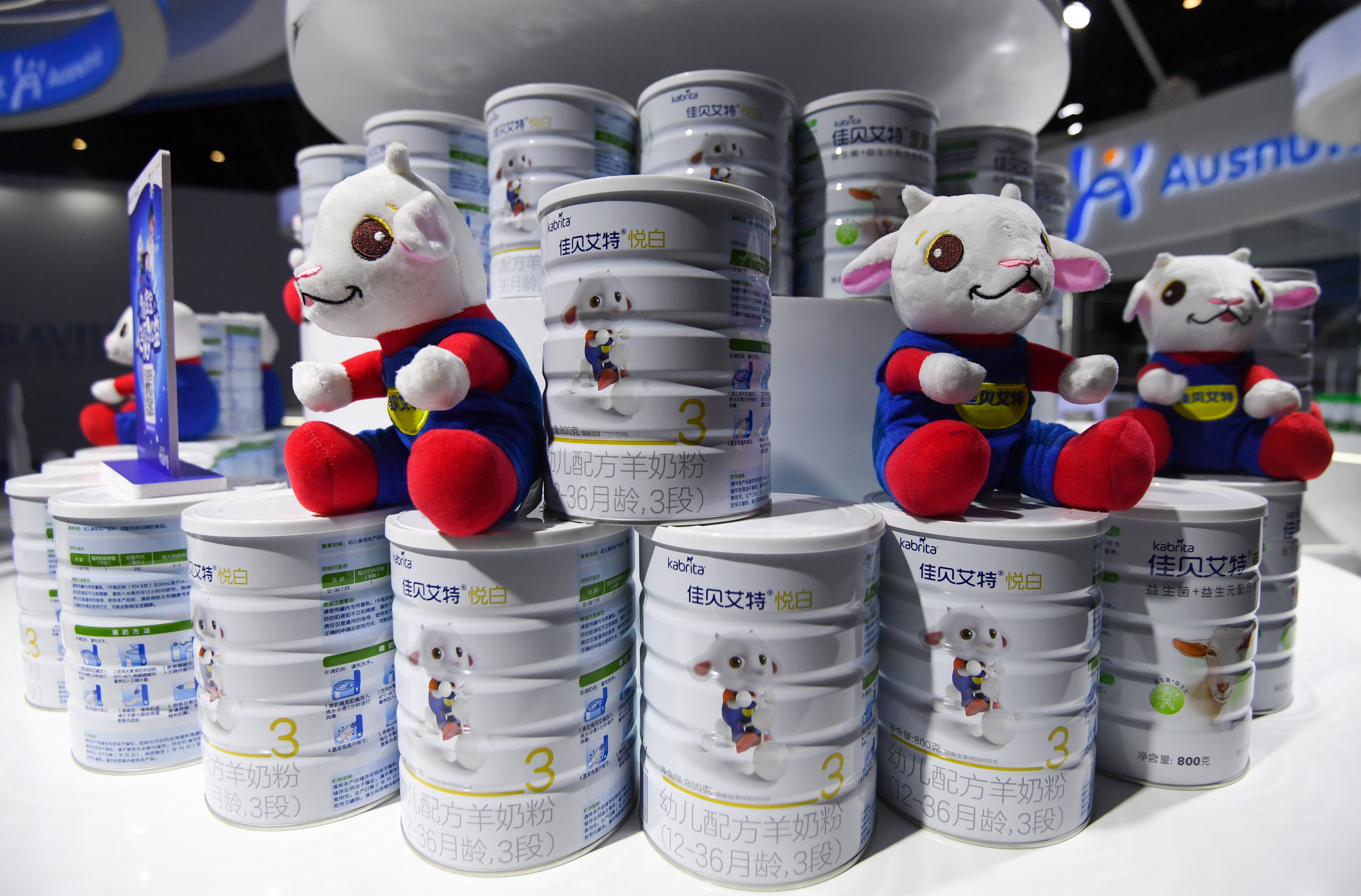 第三届中国国际进口博览会食品及农产品展区的一个羊奶粉展位(11月3日摄)。新华社记者 陈晔华 摄