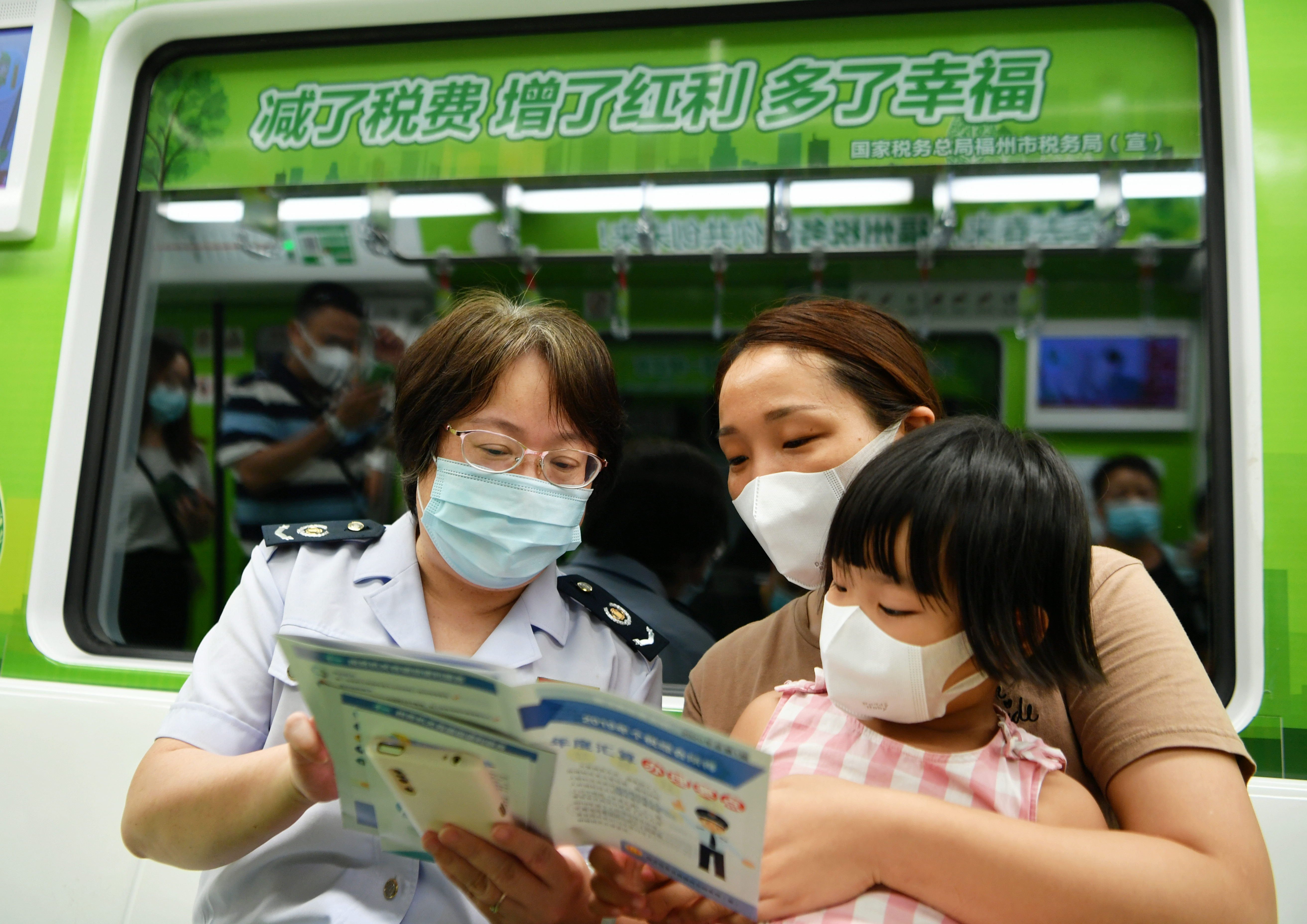 2020年6月12日,国家税务总局福州市税务局所得税科科长池劲松(左)在“个税号”地铁上向市民宣传个人所得税及年度汇算相关知识。新华社记者魏培全摄