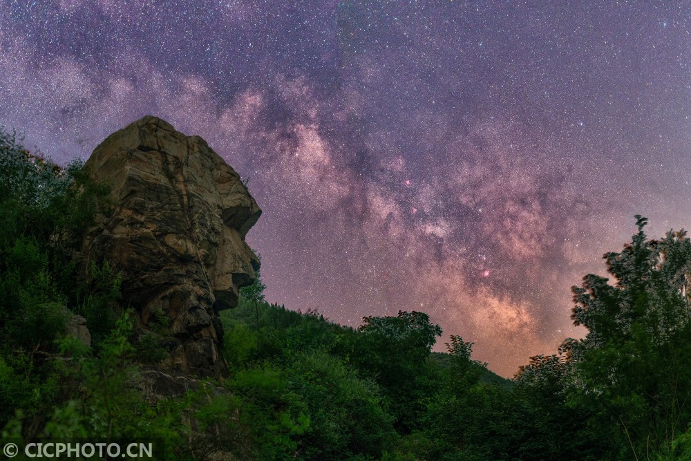 ↑2020年6月20日,山东济南,一座“石猿”凝望着银河。CICPHOTO/张前进 摄