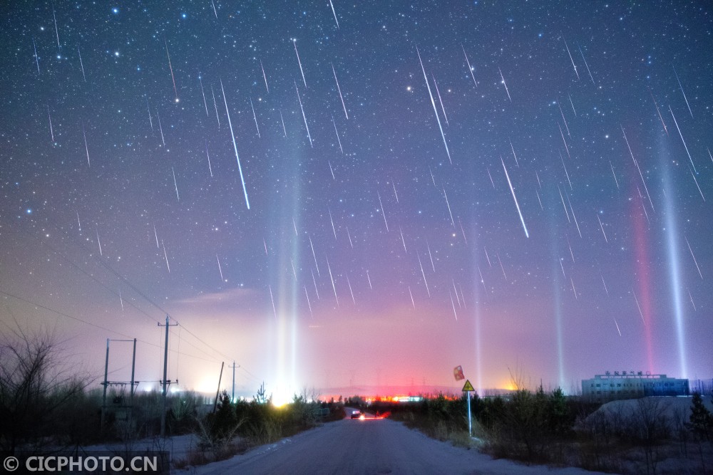 ↑2020年12月14日,内蒙古多伦县,夜空的流星雨坠入凡间的寒夜灯柱,这是两道瞬息光芒的相遇与相知(多张叠加拍摄)。CICPHOTO/黄丹丹 摄