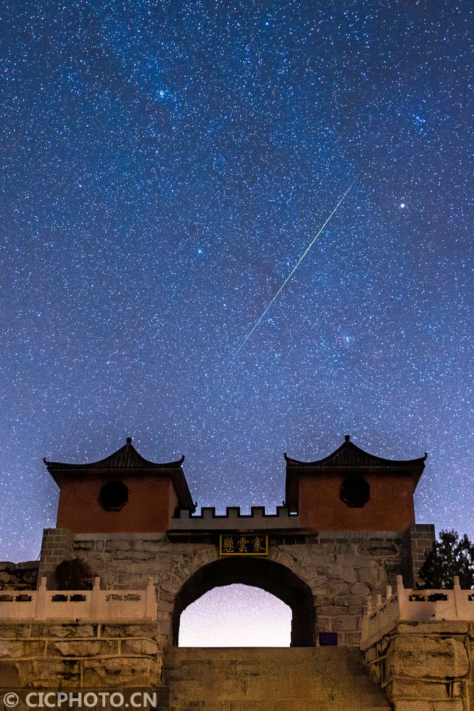 ↑2020年12月12日,山西盂县,一颗流星在悬云寨上空划过。CICPHOTO/周宏 摄