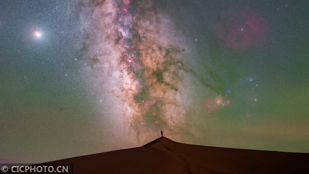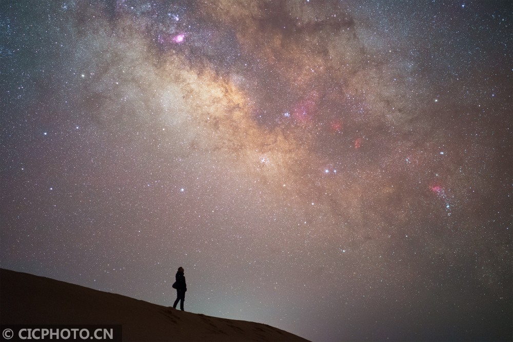 ↑2020年7月24日,青海金子海沙漠,梦幻的夜空色彩。CICPHOTO/周飞 摄
