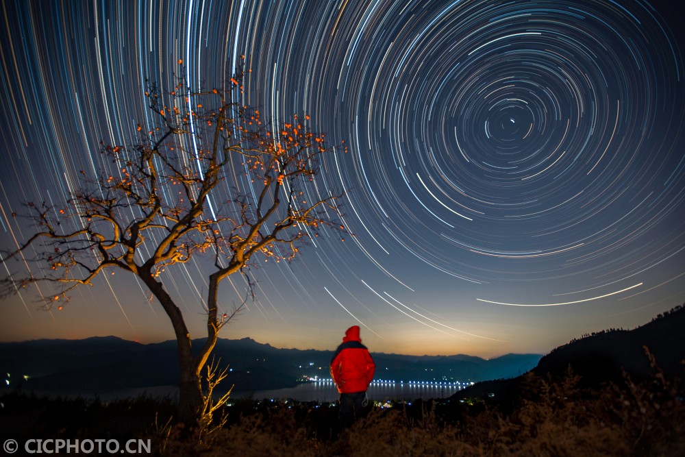 ↑2020年12月9日,山东淄博太河水库,星空下的柿子树和我(多张叠加拍摄)。CICPHOTO/宋伟东 摄
