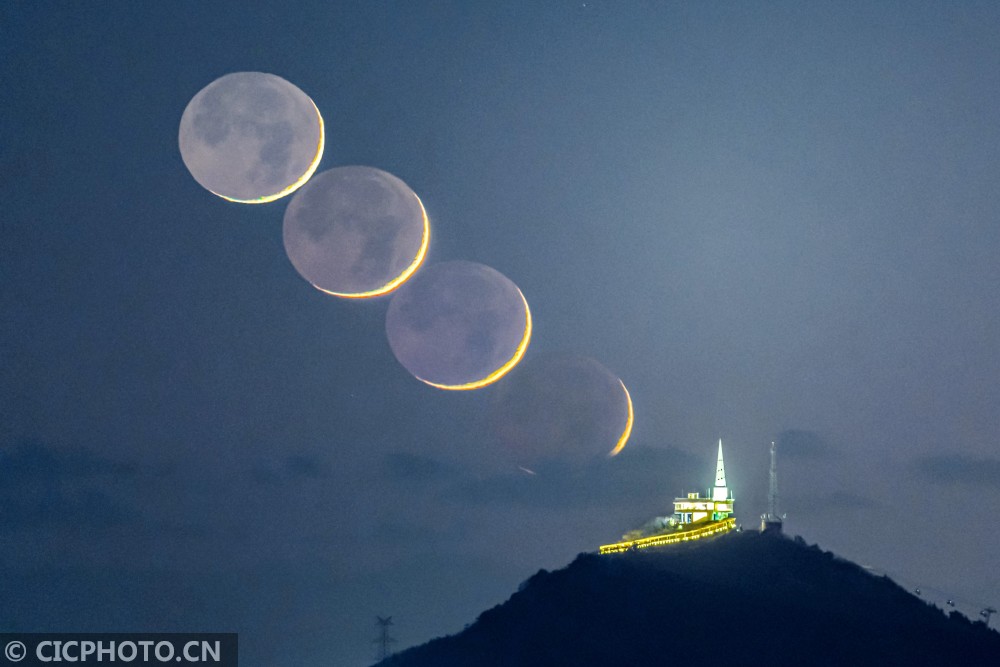 ↑2020年12月16日,辽宁大连,蛾眉新月西沉(多张叠加拍摄)。CICPHOTO/何世记 摄